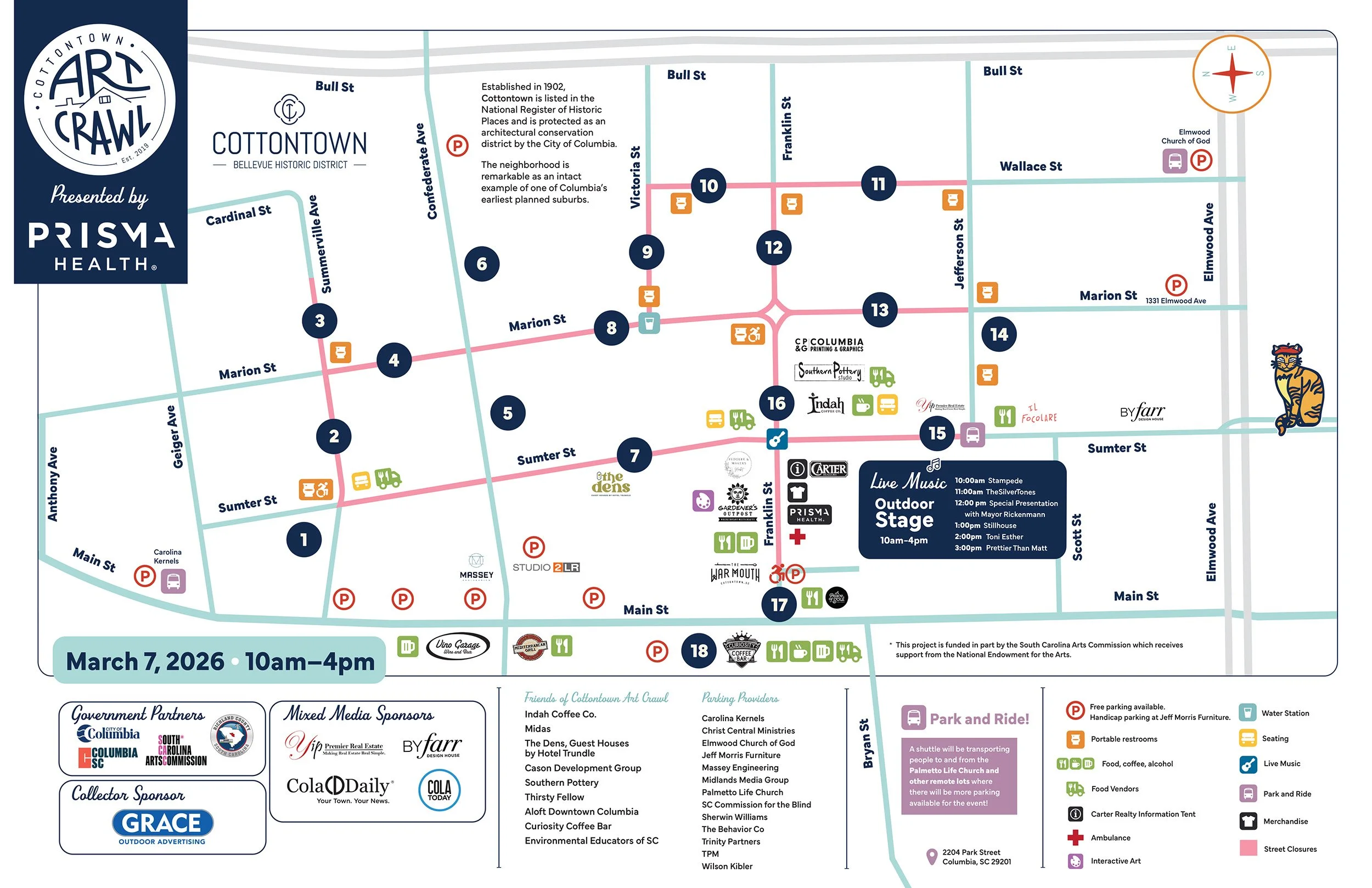 The Cottontown Art Crawl, presented by Prisma Health, is a free, outdoor arts festival featuring 230 artists, live music, food vendors and more in the historic Cottontown-Bellevue neighborhood of Columbia, SC. Attendees can explore and purchase art while enjoying a lively community atmosphere.When is the Cottontown Art Crawl?