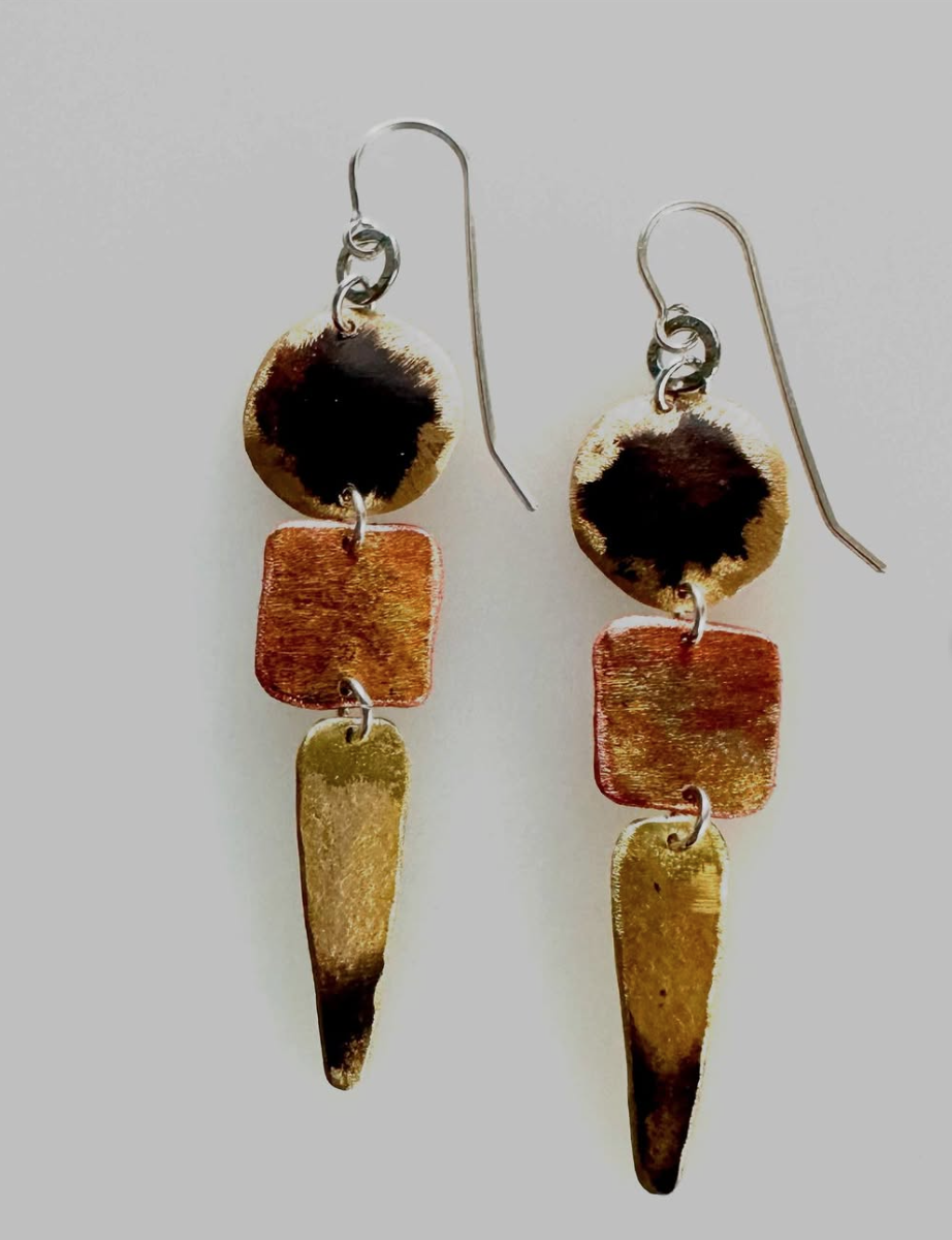 C19 Handmade jewelry is made by William Felder shaping brass, copper and sterling wire and sheet into textural forms finished with colorful patinas, leather, pearls & semi precious stones.