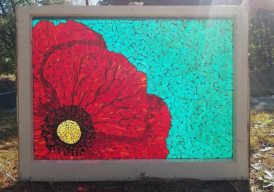 My name is Angie McConnell. I am a native Colatown resident in the downtown area. I love the art scene here and love to create in lots of mediums. I have done photography and received a ribbon in the state fair. I have done cookie and cake decorating. I was the Artist-in-Residence at Logan Elementary for a couple of years. Currently, I am a seamstress part-time at Soda City Sewing and make glass mosaics part-time. I love to use old window as the base for a piece, most of which came from houses in the downtown area.