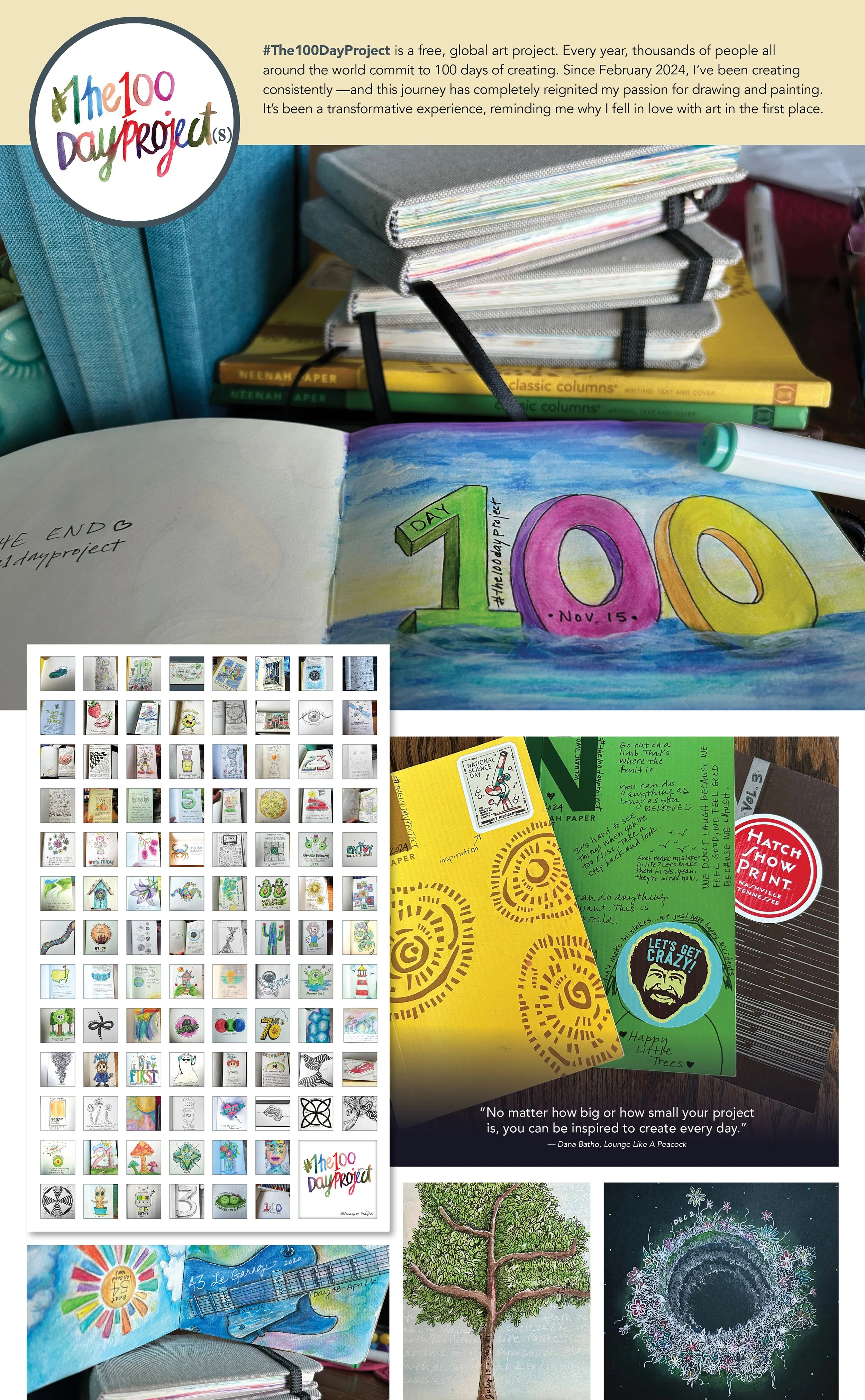 In 2024, I joined The 100 Day Project, using art journaling to unwind and explore creativity beyond design work. I began with daily doodles, then evolved into themed pages such as pairing songs with each day number and creating caricatures inspired by Rolling Stone’s Top 100 Singers.