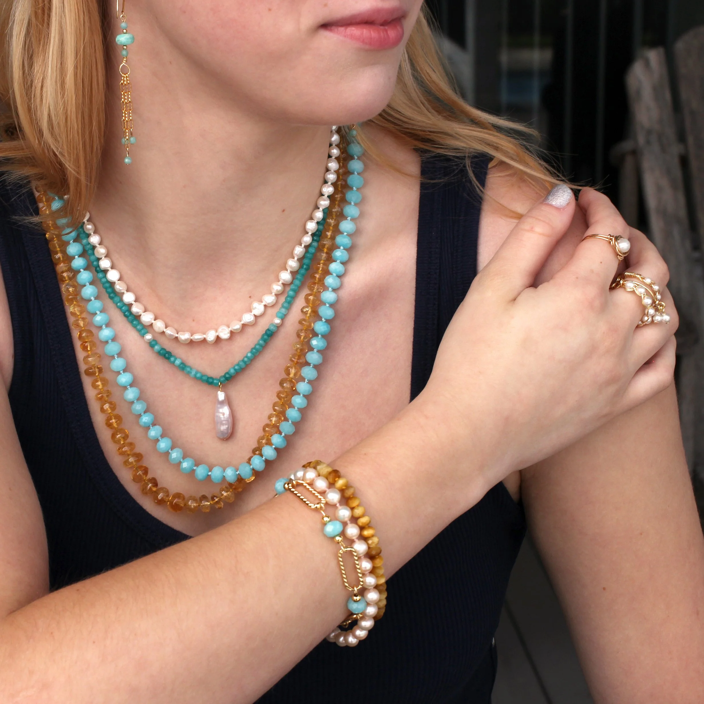 My love of gemstones was sparked by a geology course I took in college. I have always been drawn to their beauty and healing energy. I wanted to create timeless jewelry that surpasses the test of time. Now that my children are grown, I am able to devote myself fully to my creations. I am self-taught and I create every piece by hand. I use silk thread to string and hand-knot necklaces and bracelets. I also employ soldering and hand-wiring to make earrings, bracelets, pendants, rings, and suncatchers.