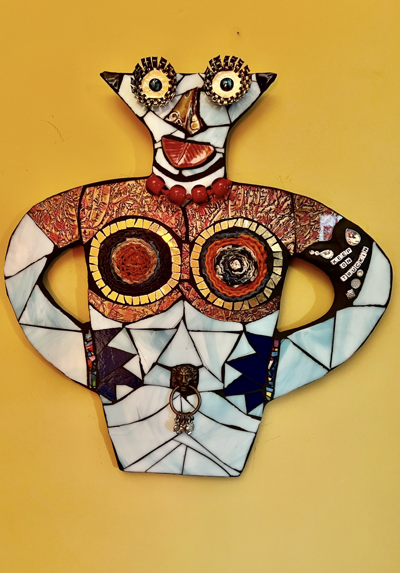 I have always had a passion for creating handcrafted items. Several years ago, I found some old windows on the side of the road and started making glass on glass mosaics. I enjoy making faces and other whimsical pieces.