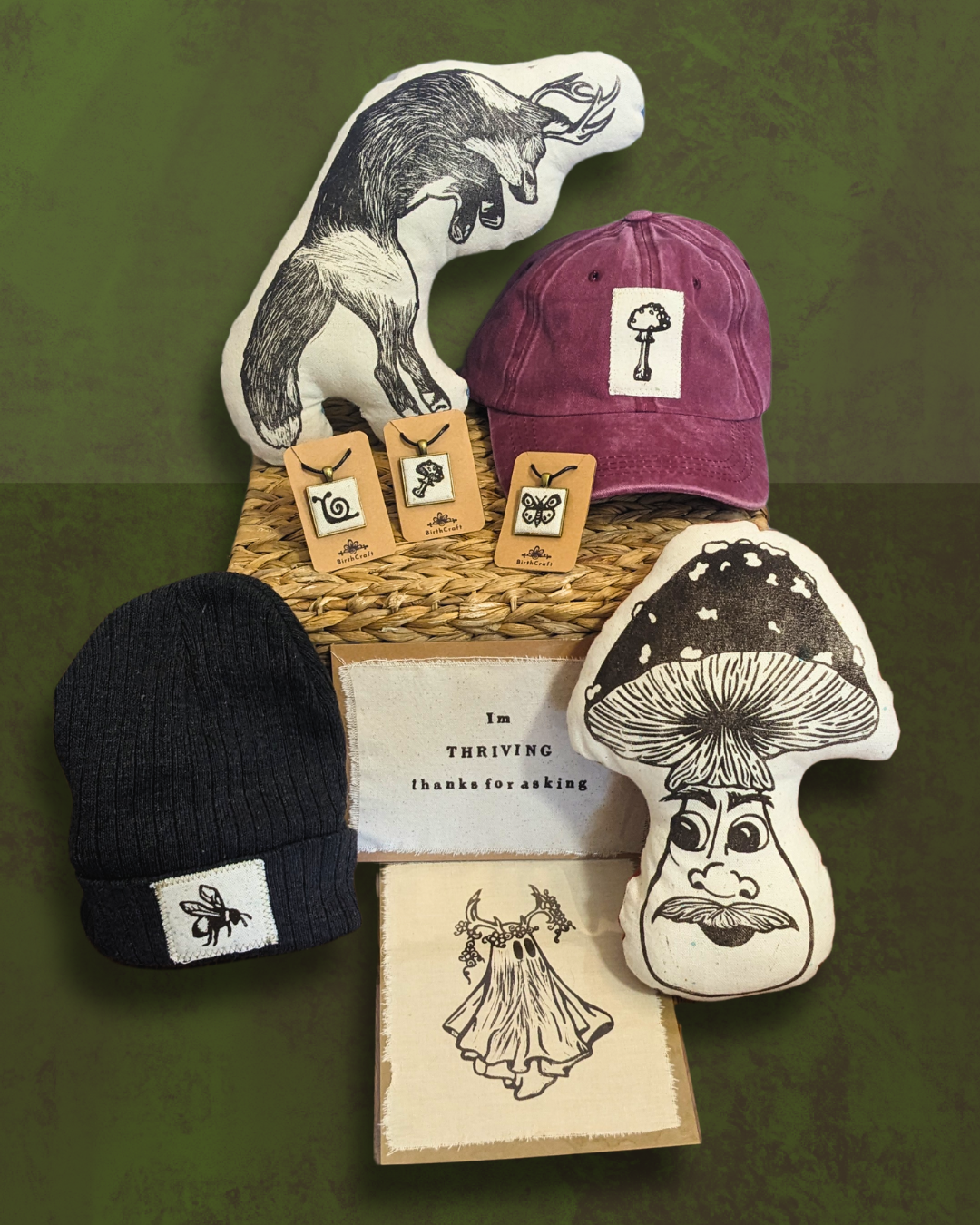I’m a linocut printmaker who specializes in earthy and whimsical functional art and home goods. My products include: hand pulled and carved linocut prints on fabric (which I sell as patches/prints and some of which are framed), hats, jewelry, plushes, ornaments, and upcycled hand printed clothing. My designs focus around ecology, cryptids, and earth based spirituality. I am also a tarot reader and have success vending my art and doing readings at my booth in tandem with one another.