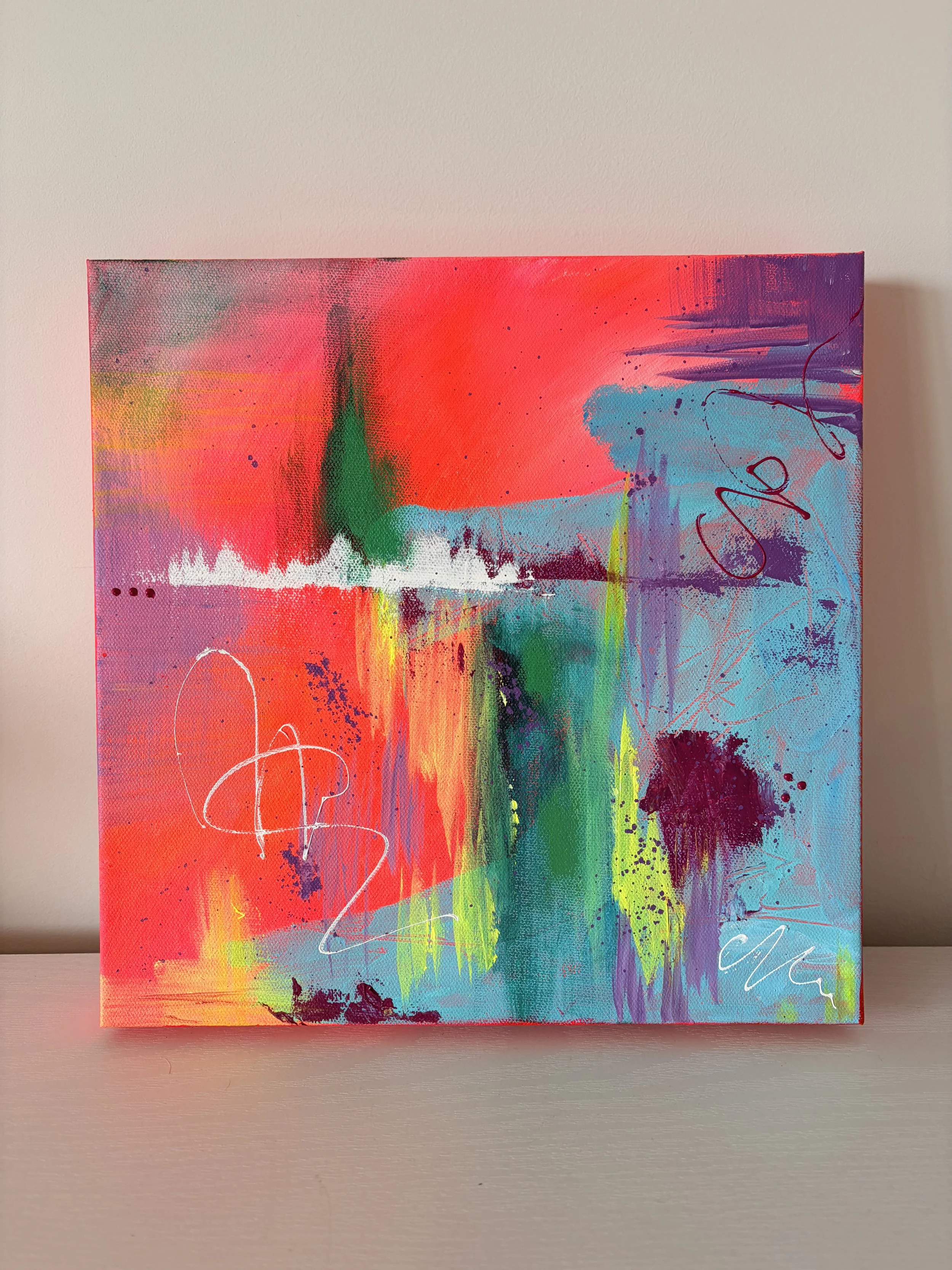 Kimberly has been creating since childhood, later formalizing her passion with an art minor in college. After returning to her practice in recent years, she now paints through an intuitive, emotion-driven process. Guided by color and movement, her work translates feeling into abstract forms, inviting viewers into an immersive, expressive experience.