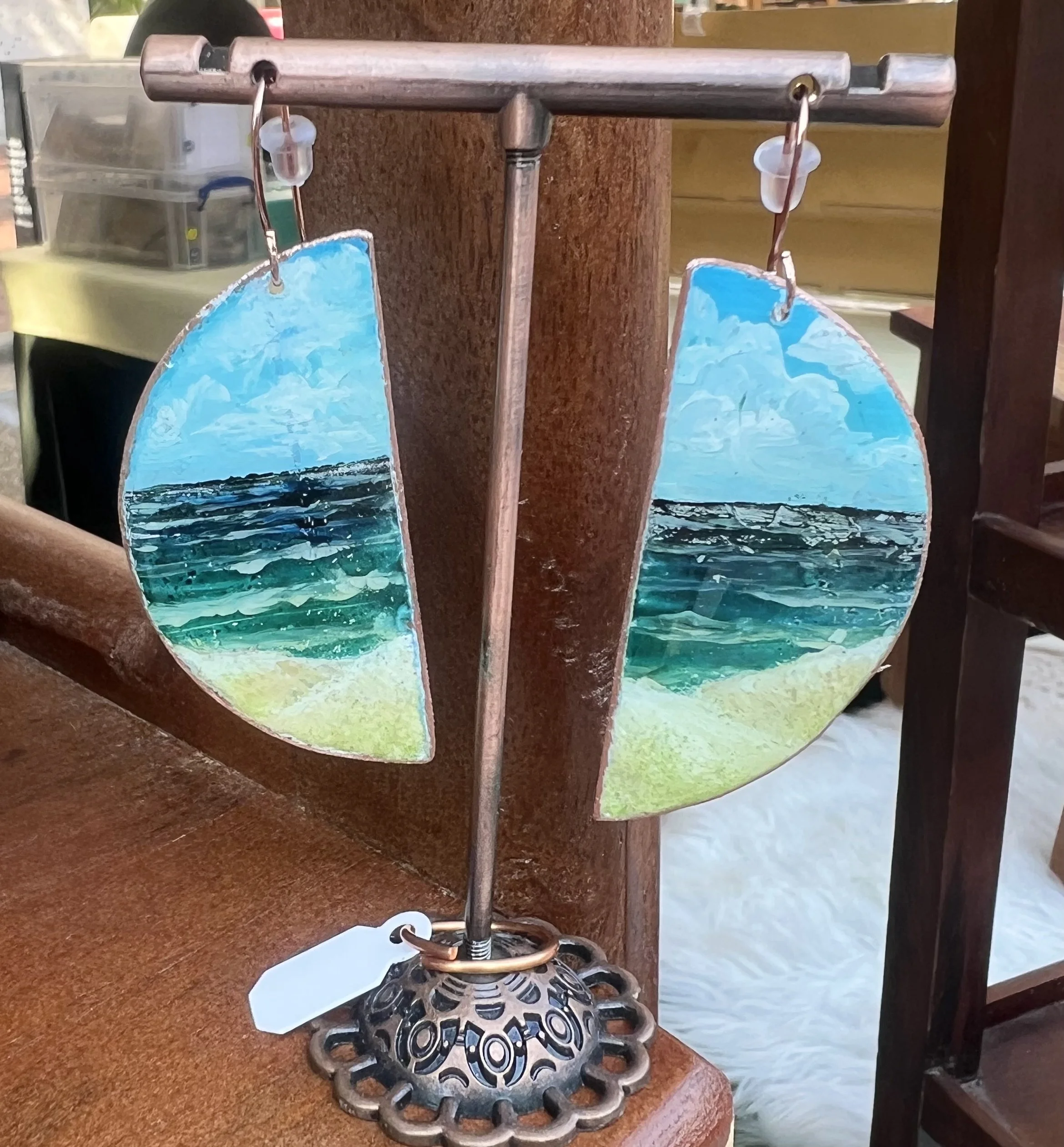 Copper Loft Designs came into existence when a hail storm damaged our roof in 2014. While having our shingles replaced, copper flashing, which my husband decided to save, was discovered around our chimneys. After our last child went to college in 2020, I began cutting pieces of the copper, painting them, and making them into earrings. Since then, we have acquired roofing copper from several old buildings (some almost 100 years old), and so their stories live on and our business thrives, combining both history and creative up-cycing.