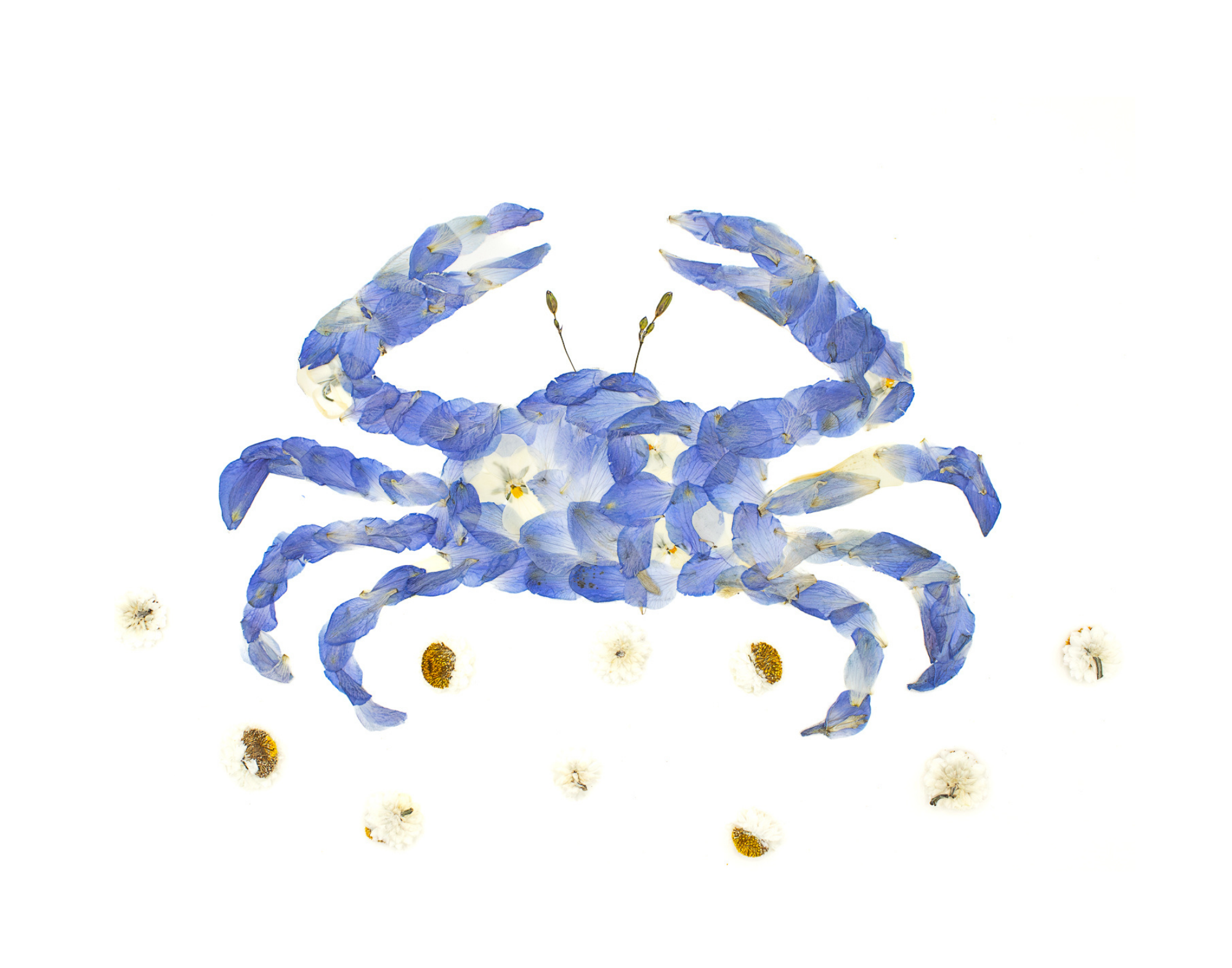 Original pressed-flower artworks framed under glass, featuring natural botanicals arranged into whimsical designs and floral compositions.